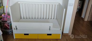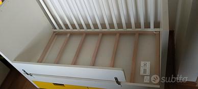 Lettino con cassetti misure 65x125. Completo di materasso, base del lettino regolabile a 3 altezza (per neonati e bambini più grandi). Compreso sponda di protezione come Nella foto oltre a al 4 pannello di chiusura (in foto non è montato) altezza 86.