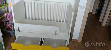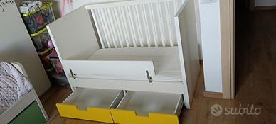 Lettino con cassetti misure 65x125. Completo di materasso, base del lettino regolabile a 3 altezza (per neonati e bambini più grandi). Compreso sponda di protezione come Nella foto oltre a al 4 pannello di chiusura (in foto non è montato) altezza 86.