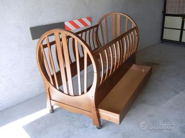Lettino in legno con sponde ribaltabili e cassetto. Dimensioni cm 131 x 73. Altezza cm 102 parte alta e cm 84 sponde.