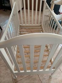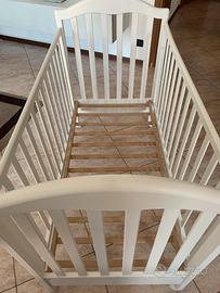 Lettino per bambini con sponde regolabili. Possiede le ruote. É stato verniciato da me di bianco con colori atossici adatti al contatto con bambini, circa un anno fa, poi mai usato in quanto a mia figlia non piaceva dormirci all’interno.
