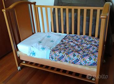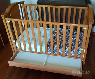 Lettino Foppapedretti per bambini da pochi mesi a 5 anni, in vero legno, con una sponda fissa e una regolabile a 3 posizioni (tutta su, a metà, a scomparsa sotto il lettino), testiera e pediera con disegno pantografato. Provvisto di cassettone sottostante.