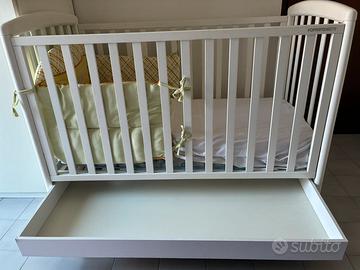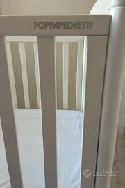 Lettino Foppapedretti bianco con sponda regolabile in altezza, rete a doghe, un cassetto nella parte inferiore e ruote con sistema frenante. Compreso nel prezzo c’è un materasso usato pochissimo il paracolpi e tre completi di lenzuola per lettino. Dimensioni lettino montato: cm 131 x 73 x 108. Non spedisco.