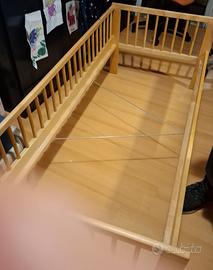 Lettino per bambini, marchio IKEA, modello GULLIVER, con struttura in legno, presenti segni di normale usura, qualche adesivo, ma ancora in ottime condizioni; compreso di base a doghe in legno "Sultan Lade" e spondina laterale removibile.