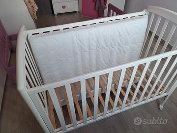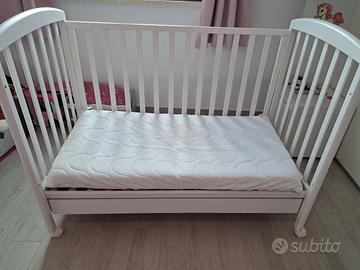 Lettino con cassettone. Una sponda può alzarsi ed abbassarsi. All'occorrenza l'altra sponda può togliersi. Presenti i freni sulle ruote. Materasso compreso.