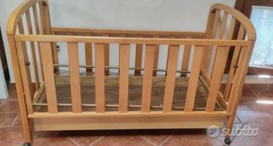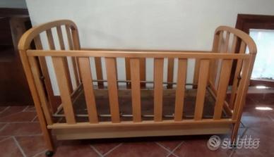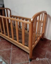Lettino in legno per bambini in ottime condizioni, con ruotine e sponde regolabili. Compresa cassettiera e rete ma non di materasso