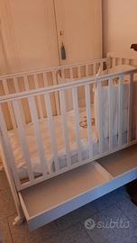 Lettino per bimbi "Azzurra Design Web Bianco": sponda laterale mobile in legno di faggio massiccio, dotato di rete a doppia posizione in rete a doghe, in legno di faggio massello priva di vernici atossiche, sponde a norma di sicurezza, comodo cassetto utilizzabile da ambo i lati, spigoli arrotondati per garantire massima sicurezza, quattro ruote piroettanti rivestite in gomma "antigraffio" con due sistemi di freno, vernici e materiali atossici, una spondina fissa per la sicurezza del bimbo. Misure interne: 125x64cm. Misure lettino: cm. 71x130x102 h. Prezzo trattabile.
