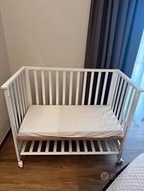 Lettino con sponda laterale per bambini in legno, com materassino e copri materasso.