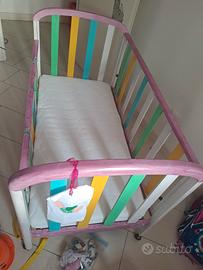 Lettino per neonati con sponde regolabili, completo di materassino e volendo cuscino.