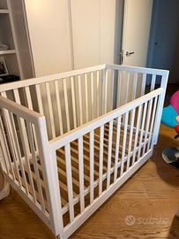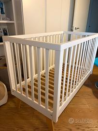 Vendo lettino per neonato in legno massello, colore bianco con gambe in legno naturale, dal design moderno e pulito.