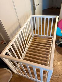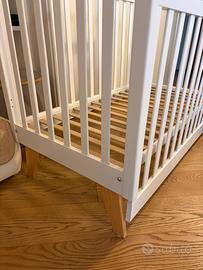 Vendo lettino per neonato in legno massello, colore bianco con gambe in legno naturale, dal design moderno e pulito.