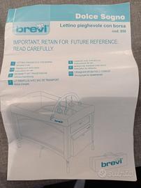 Vendo lettino pieghevole Brevi con borsa e di materassino (accessorio incluso). E' adatto per bambini da 0 a 4 anni circa (15 kg). Compreso di kit doppia altezza (0-3 mesi), fasciatoio, arco giochi e tasca laterale porta pigiama. E quando il bambino sarà cresciuto, la porta con cerniera potrà essere aperta per permettere al bambino di uscire dal lettino da solo. Grazie alle 2 ruote è possibile spostare il lettino con facilità. In ottimo stato.