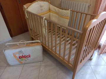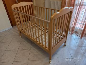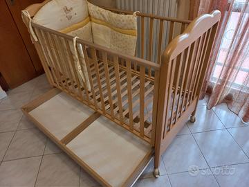 Lettino in legno usato ma tenuto benissimo, come nuovo. Sponde regolabili rivestite con protezione atossica. Completo di cassetto inferiore sotto il letto ed eventuale buon materasso e guanciale. Prezzo indicato trattabile (riferito al solo letto ed eventuale materasso e guanciale) Disponibili n°2 kit paracolpi laterali (visibili in foto) e piumoncini (sovrapprezzo da concordare) tutto lavato e sterilizzato in lavanderia. Possibilità di trasporto immediato nelle vicinanze. Misure cm133x70x110H.