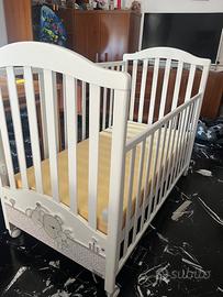 Lettino per bambino o bimba in legno con: - entrambe le sponde rialzabili e abbassabili, - cassetti contenitori sotto - materasso metà matrice e metà spugna - 4 ruote con possibilità di blocco, - cuscino intorno parabordi - legno verniciato bianco - corredo abbinato toni beige/bianco - piumino 4 stagioni Va benissimo per bambini fini anche ai 4/5 anni in quanto bello grande e resistente Acquistato da Prental. Usato ma in ottime condizioni.