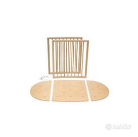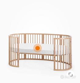 Lettino Stokke con TUTTE le estenzioni: da cula al letto fino 10 anni; materassi, ruote, appenti tendina. Originale, colore legno naturale.