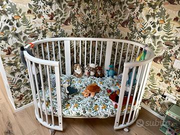 Lettino Stokke Sleepi V2 in legno colore bianco, adatto ai bambini fino ai 3 anni con ruote piroettanti con freno e base regolabile in altezza, spondine laterali removibili, completo di materasso. Usato con attenzione e cura.