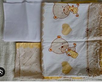 lnclude baldacchino , copripiumino, fodera ( motivo orsetti con biberon in colori giallo marroncino, unisex) e materasso in gommapiuma 70 x 140 cm