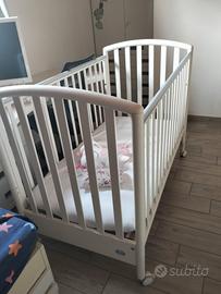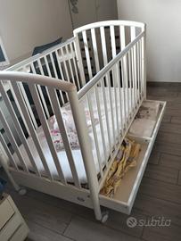 lettino in legno colore bianco con sponda che si abbassa e due cassetti . usato ma in ottimo stato