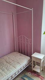 Letto a baldacchino in ferro verniciato per bambina, rete in doghe legno e comodino in legno. misure rete 80 cm x 190 cm misure letto 95 cm x 200 cm, altezza 208 cm compreso materasso.