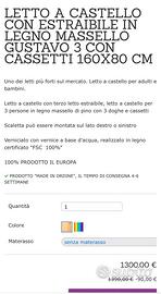 Letto a castello per 3 persone in legno massello - modello "Gustavo 3" Usato in perfetto stato, completo di tre materassi. Struttura in legno massello, robusta e resistente Terzo letto estraibile, ideale per ospiti o fratelli/sorelle Due cassetti capienti sotto il letto per biancheria o giochi Dimensioni materassi: 160x80 cm. SEMPRE usati con incerate: pulitissimi! Design elegante e verniciatura di alta qualità Acquistato a 2.069€ (1.350€ struttura + materassi), è stato tenuto con grande cura in ambiente non fumatori. Dopo 8 anni di utilizzo sembra ancora nuovo: lo splendido legno massello e la verniciatura sono davvero di ottima qualità e dimostrano la durata e la bellezza del prodotto nel tempo. Occasione imperdibile per chi cerca qualità e funzionalità a un prezzo vantaggioso.