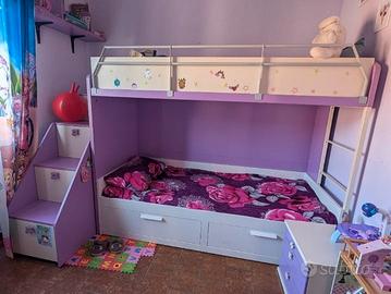 Vendesi bellissimo e funzionale letto a soppalco per cameretta, color lilla e bianco, ideale per ottimizzare lo spazio. La struttura è robusta e include diversi accessori molto pratici.