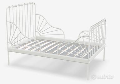 Letto allungabile IKEA MINNEN in acciaio colore bianco e doghe in legno completo di materasso originale ikea che si adatta alla lunghezza del letto.