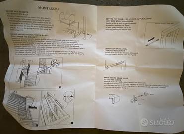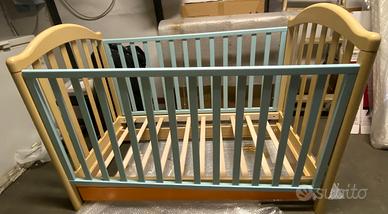 Lettino Baby Italia made in Italy con testate in legno sbiancato,sponde col. azzurre (una reclinabile e asportabile), cassettone inferiore col. mandarino e ruote con blocco.