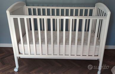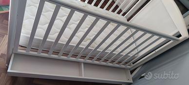 Letto per bambini Pali con le sbarre di colore bianco e grigio con orsetto di colore neutro adatto per maschietti e femminucce. Il letto è dotato di cassetto contenitore di biancheria, di rete con doghe in legno e di materasso in aloe vera alto 16 centimetri. È stato usato due volte, è nuovo.