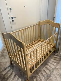 Letto co sponde ad altezza variabile, con 2 altezze del materasso per prima infanzia e fino a 5 anni. Con materasso in lattice, coprimaterasso, 2 para colpo laterali e piumino/coperta. Nn spedisco