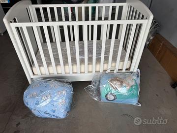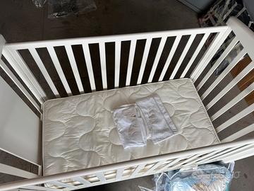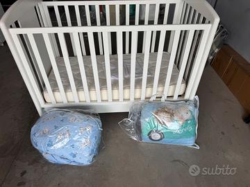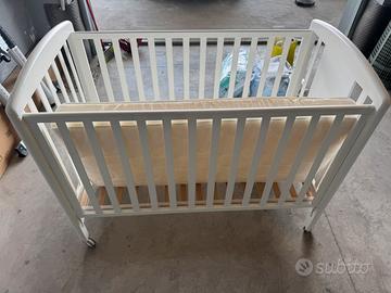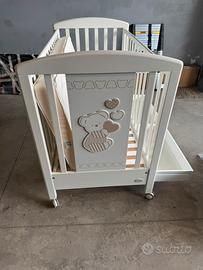Lettino Nana misure 130 cm larghezza, profondita 68 cm e altezza 93cm, con cassettiera. Materasso 120x60 in MEMORY (praticamente nuovo) com con coprimatersso, e lenzuoli .