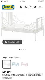 Vendo struttura letto per ragazzi allungabile di colore bianco con misure 80x200 cm comprensivo di doghe in legno. Modello ikea MINNEN, allungabile da 137 cm a 207 cm. Insieme alla struttura allego anche il materasso ( 3 pezzi per le varie misure).