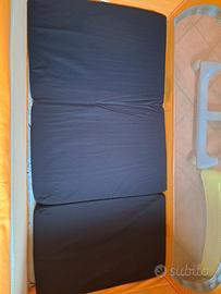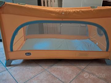 Vendo letto campeggio bimbo marca Chicco usato praticamente nuovo misure 110x60 richiudile completo anche di rete e materassino blu Prenatal nuovo. Condizioni ottime