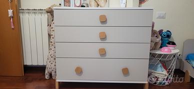 la cassettiera ha 4 cassetti molto capienti e sopra vi è un fasciatoio removibile con struttura in legno.