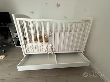 Lettino in legno bianco, con spondina mobile e cassetto sotto. Letto in ottime condizioni. Marca Foppapedretti.