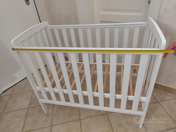 Letto a cancelli salvaspazio - in ottime condizioni, usato pochissimo per una casa al mare - età consigliata 0- 3 anni - ingombro totale 104*54 per materasso 100*50- Altezza cm 90 - base regolabile in 3 posizioni, per tenere in sicurezza il bambino via via che cresce. includi nel prezzo materasso, coprimaterasso impermeabile e paracolpi