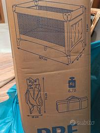 Lettino da campeggio / da viaggio, per bimbi. Marchio prénatal. In confezione originale, misure come da foto : 127 x 67 la base, 74cm di altezza. Richiudibile 'a ombrello' ingombra solo 20cm. Il peso della confezione è di circa 9kg