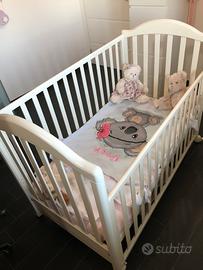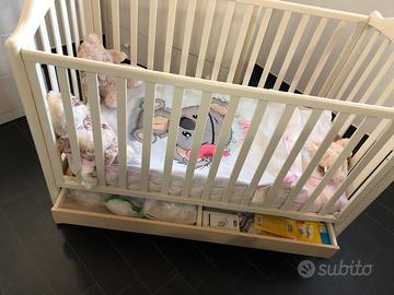 Lettino mibb con materasso incluso, cuscino e paracolpi. E dotato di un cassettone estraibile e di sponde a sconparsa cosi è facilmente affiancabole al letto dei genitori.