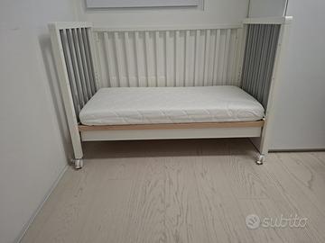 Il letto è un lettino per bambini, bianco con sponde a mezza altezza per scendere, a doghe verticali (bianche e grigie). Il materasso bianco poggia su una base in legno chiaro, sotto c’è un cassetto estraibile. Il lettino ha anche ruote posteriori per facilitarne lo spostamento.