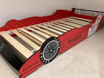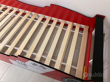 A forma di macchinina rossa, la rete ha le doghe in legno, molto confortevole.