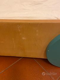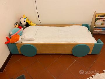 Vendo letto montessori 70x160 a forma di macchina completo di futon marca Woodly realizzato al 100% in puro cotone non trattato, antiacaro, termoisolante e anallergico composto da 5 falde per uno spessore totale di circa 12cm e paracolpi sempre Woodly in cotone biologico. Aggiungo anche n.3 coprimaterasso in cotone e n.2 salvamaterasso. La struttura letto è stata realizzata da un falegname e presenta segni di usura. Diversamente il futon è in perfette condizioni