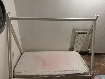 Letto Montessoriano a Capanna (con materasso) Trasforma la cameretta in un piccolo rifugio magico! Questo letto a forma di capanna, ispirato ai principi Montessori, è l'elemento ideale per favorire l'autonomia e la sicurezza dei più piccoli, permettendo loro di salire e scendere in totale libertà. • Design Unico: Struttura in legno a forma di casetta, perfetta da decorare con lucine, ghirlande o tessuti per creare un ambiente nanna sereno e stimolante. • Accessibilità: La base bassa (vicino al suolo) previene cadute accidentali e incoraggia l'indipendenza del bambino. • Incluso nel Set: Materasso coordinato di alta qualità, scelto appositamente per le dimensioni della struttura. • Stato dell'oggetto: Conservato con cura e in ottimo stato generale, pronto per accogliere nuovi sogni. Un pezzo d'arredamento che non è solo un posto dove dormire, ma uno spazio per giocare, leggere e crescere.