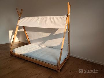 Vendo letto da bambino rasoterra stile montessoriano in legno naturale massello a capanna indiana completo di materasso artigianale in memory 80x160 e tenda di copertura in cotone. Condizioni perfette, materasso sfoderabile ed igienizzato. Solo ritiro a mano Torino e cintura.