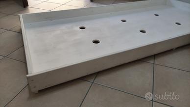 Vendo letto a terra montessoriano in legno massello di abete certificato dipinto con vernice bianca atossica ad acqua con venature del legno visibili, fornito di kit piedini (altezza da terra della base del letto di circa 30 cm) per avere la possibilità di alzarlo da terra.
