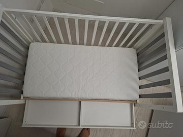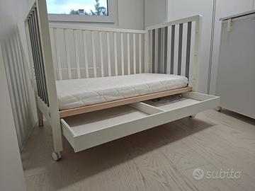 Il letto è un lettino per bambini, bianco con sponde a mezza altezza per scendere, a doghe verticali (bianche e grigie). Il materasso bianco poggia su una base in legno chiaro, sotto c’è un cassetto estraibile. Il lettino ha anche ruote posteriori per facilitarne lo spostamento.