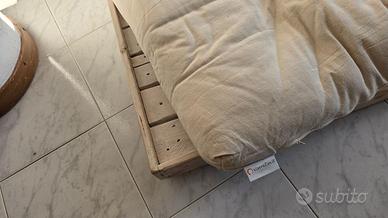 Il materasso è in pula di farro biologico, il rivestimento in cotone bio, legno trattato cera naturale.