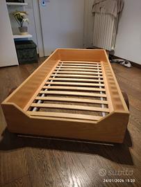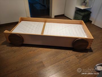 Lettino montessoriano fatto fare da un artigiano in legno massiccio. Misure 166x19x30h, completo di materasso in ottime condizioni. Va bene per bambini fino ai 5 anni