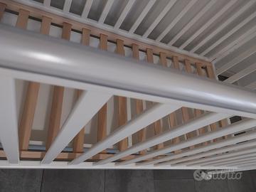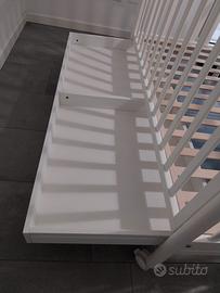 letto in legno, bianco, senza difetti. si può regolare a due altezza, per neonati o bimbi un po più grandi.munito di cassettino estraibile. e sbarra di protezione ch3 si abbassa x prendere il bambino.