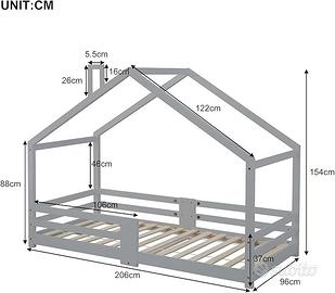 Vendo Letto per bambino a forma di casetta, usato pochissimo (neanche 1 anno) e tenuto molto bene; il letto e' gia stato smontato, viene fornito con le istruzioni ricevute all'acquisto e le viti/dadi necessarie. Viene fornito con il materasso, usato ma in ottime condizioni. Da ritirare a Modena, gia' smontato. Info prese dal sito di acquisto: "Letto in legno massiccio per bambini per bambini Si adatta al materasso con 90 x 200 cm, il design che salta spaziale può essere facilmente portato fuori nella stanza dei bambini. Dimensione totale: 206 x 96 x 154 cm (L x W x H), max. Resilienza: 80 kg, età adatta: 5-10 anni. Il colore neutro di odore sull'acqua protegge la salute di tuo figlio"