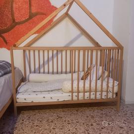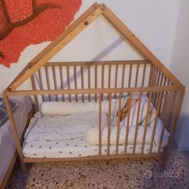 Lettino per bambini in faggio Ikea Sniglar, doppia altezza, con sponde, modificato da me come da foto, con materasso e cuscino.
