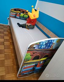 Vendo letto con immagine Treno su due punti, come da immagine. Stile Montessori perché l'altezza da terra è bassa ideale dai 2 anni fino ai 6 anni circa per l'autonomia del bambino. misure particolari 180*80 fornito insieme al materasso, il materasso è ovviamente usato, attenzione va un materasso molto fine. la sbarra non l'ho mai usata. Vendo perché ormai il bambino ha 7 anni ed era troppo basso per lui.