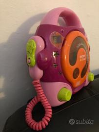 Lettore CD con due microfoni sing a long ed effetti luminosi. Lettura CD o MP3 tramite lettore o la presa USB. Tasti per selezione traccia e tasto per ripetizione del brano. Possibilità di programmare i brani e riascoltarli in sequenza. Apposita manopola per controllare il volume dei due microfoni. Display digitale con indicatore numerico di traccia. Presa per cuffia (non inclusa). Porta USB per Flash Drive. Alimentazione: 4 batterie da 1,5.Dim.: 275 x